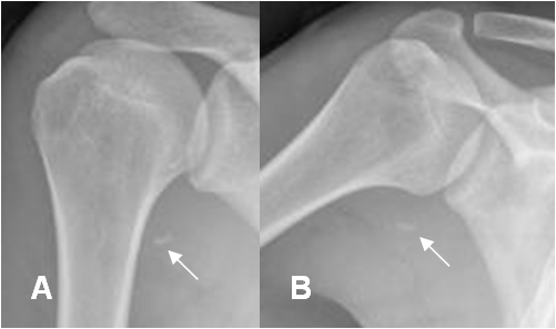 A: Rx AP y B: Rx axial. Fragmento óseo en la parte interna del brazo, que corresponde a avulsión, por ruptura del ligamento glenohumeral inferior.