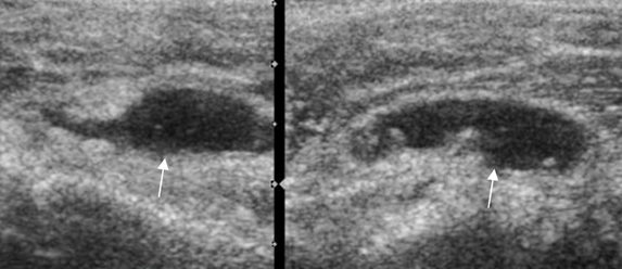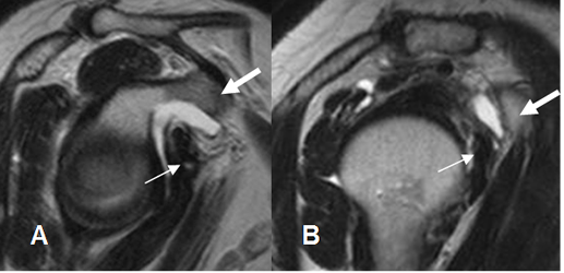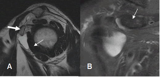 A: y B: RM sagital en T2. Colección líquida entre el músculo subescapular (Flechas
