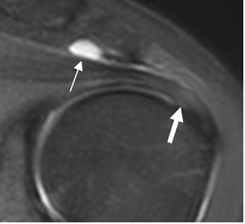 RM coronal en STIR. Colección a nivel subacromial, por bursitis. (Flecha delgada). En tendón del supraespinoso es hiperintenso, por tendinitis asociada. (Flecha gruesa).