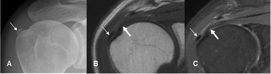 A: RM sagital en T2. Colección líquida por delante del músculo subescapular (Flecha delgada) y por debajo de la coracoides (Flecha gruesa), que corresponde a bursitis subcoracoidea.