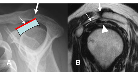 A: Rx oulet, B y C: RM sagital en T2. Componentes del arco coracoacromial: Articulación acromioclavicular (Flecha gruesa), ligamento coracoacromial (Flecha delgada) y tendón del SE (Punta de flecha).