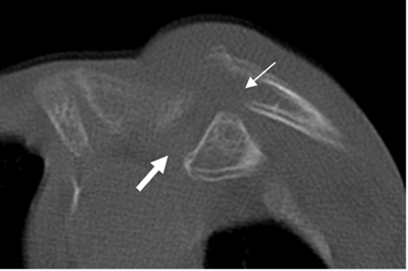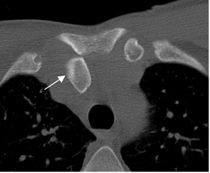 TAC axial. Desplazamiento posterior del tercio proximal de la clavícula, por luxación.
