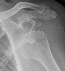 Rx AP. Cabeza humeral por debajo de la coracoides, por luxación anterior.