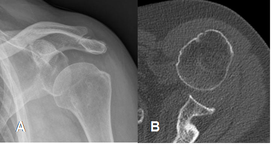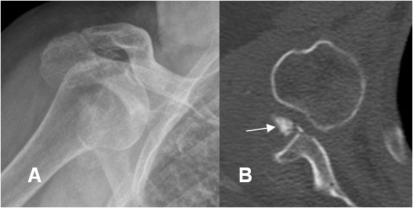 A: Rx AP y B: TAC axial. Desalineación anterior de la articulación glenohumeral, con pérdida parcial de la relación articular.