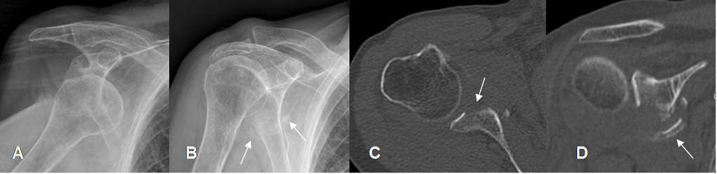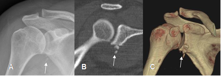 A: Rx AP, B: TAC reconstrucción coronal y C: TAC reconstrucción 3D. Hombro reducido después de una luxación anterior, donde se identifican fragmentos óseos por debajo de la glenoides, por fractura.