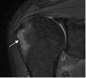 RM coronal en STIR. Zona hiperintensa en la parte superior de la cabeza del húmero, después de una luxación del hombro, por contusión ósea.