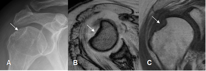 A: Rx AP, B: RM axial en FFE y C: RM coronal en T1. Zona deprimida en la parte superoexterna de la cabeza del húmero, por fractura de Hill Sachs.