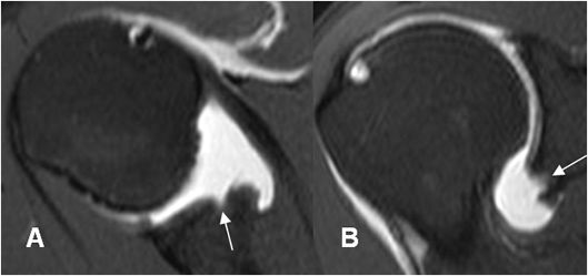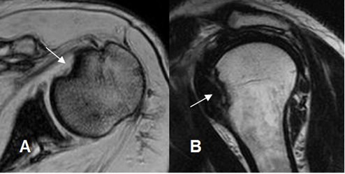 A: ArtroRM axial en STIR y B: ArtroRM sagital en STIR. Defecto del reborde anterior inferior de la glenoides y el labrum articular, por lesión de Bankart óseo. (Flechas).