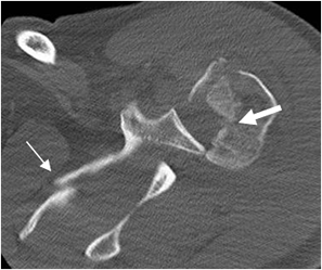 TAC axial. Luxación posterior, con fractura conminuta de la cabeza humeral. (Flecha gruesa). Adicionalmente hay fractura de la escápula. (Flecha delgada).