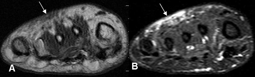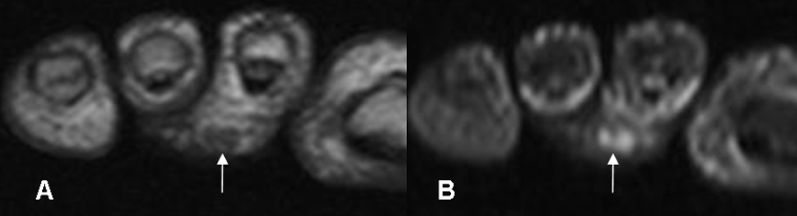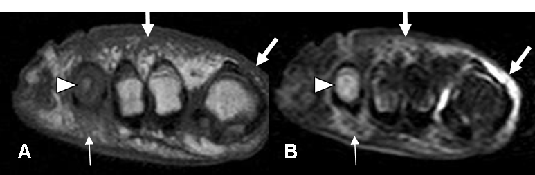A: RM axial en T1 y B: RM axial en STIR. Osteomielitis del metatarsiano y la falange proximal del 5º dedo, los cuales son hipointensos en T1 e hiperintensos en STIR (Flechas delgadas). Importantes cambios inflamatorios en los tejidos blandos del mediopié, sin colecciones.