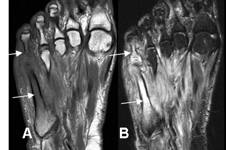 A: RM coronal en T1 y B: RM coronal en STIR. Osteomielitis del 4º metatarsiano hipointenso en T1 e hiperintenso en STIR (Punta de flecha), con cambios inflamatorios en los tejidos blandos. (Flechas delgadas). También hay cambios inflamatorios en el dorso del pie y sobre el 1º dedo. (Flechas gruesas).