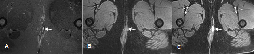 B: Thriveax T1 simple y C: Thriveax T1 con contraste. El trayecto fistuloso realza con el contraste.