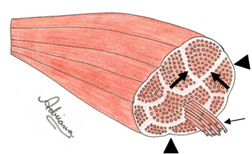 Las fibras musculares están formadas por fascículos. Los fascículos están rodeados por el perimisio, que corresponde a tejido fibroadiposo organizado en bandas paralelas. (3).