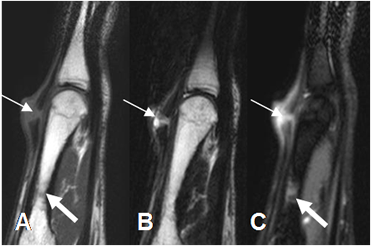 A: RM sagital en T1, B: RM sagital en T2 y C: RM sagital en STIR. Herida cortante en el dorso del 3º dedo,  con solución de continuidad en el tendón extensor, por ruptura no retraída. Adicionalmente hay contusión en el tercio medio del metacarpiano. (Flecha gruesa).