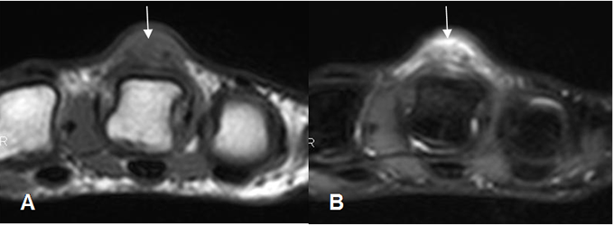 A: RM axial en T1 y B: RM axial en STIR. Igual paciente anterior. Cambios inflamatorios, con ausencia del tendón extensor, por ruptura completa.