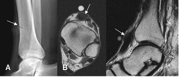 B: RM axial en T1 y C: RM sagital en T2. Tendón del tibial anterior engrosado y retraído, por ruptura completa.