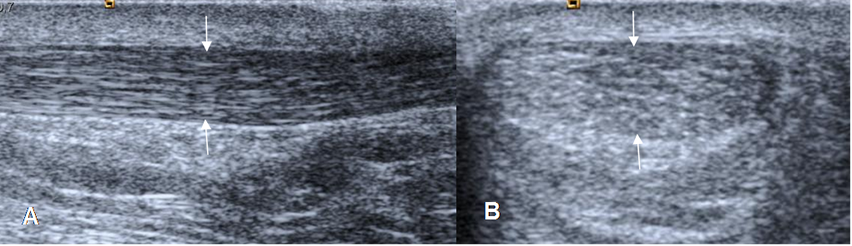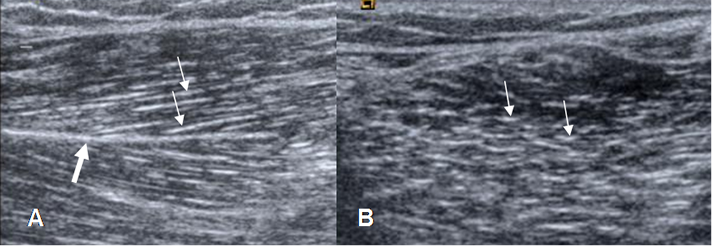 A: Ecografía corte longitudinal y B: corte transversal.  Arquitectura normal, con perimisio ecogénico (Flechas delgadas). También se identifica un septo intramuscular ecogénico (Flecha gruesa).