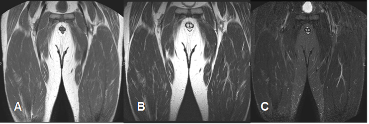 B: RM coronal en T2. Músculo hipointenso en relación con el agua y la grasa.