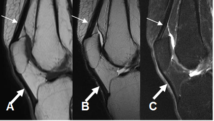 A: RM sagital en T1, B: RM sagital en T2 y C: RM sagital en STIR. Mecanismo extensor hipointenso en todas las secuencias. Tendón del cuadriceps (Flecha delgada) y tendón patelar (Flecha gruesa).