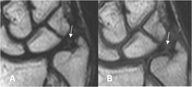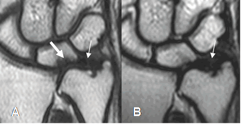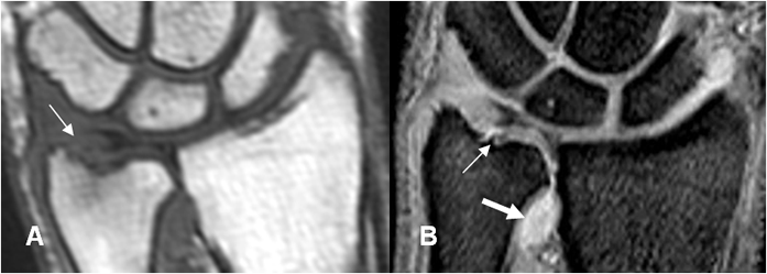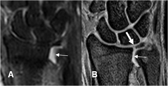 A: RM coronal en T1 y B: RM coronal en GE. Líquido en la articulación radioulnar distal, como signo de ruptura del FCT (Flechas delgadas). Hay ruptura del menisco en la inserción radial por lesión tipo 1D. (Flecha gruesa).