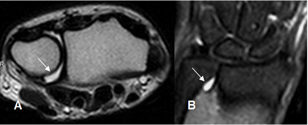 A: RM axial en T2 y B: RM coronal en STIR. Presencia de líquido en la articulación radioulnar distal, por ruptura no mostrada del FCT.