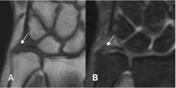 A: RM coronal en T1 y B: RM coronal en STIR. Cartílago hipointenso en T1 e hiperintenso en STIR, hacia la inserción ulnar, por degeneración. Lesión tipo 2A.