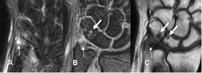 A: RM coronal en STIR. Lesión osteocondral en la ulna distal.