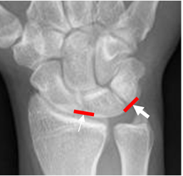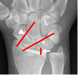 Rx AP. Ligamento radiocarpal con sus componentes radioescafoideo (Punta de flecha), radiolunado (Flecha delgada) y radiopiramidal (Flecha gruesa).