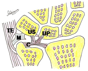 C: Cartílago articular. M Menisco homólogo. TE: Tendón del extensor ulnar del carpo. Ligamento ulnosemilunar: US y ulnopiramidal: UP.