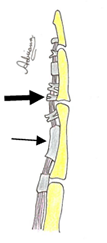 Principales poleas. A2 en la mitad de la falange proximal (Flecha delgada) y A3, en la base de la falange media. (Flecha gruesa).