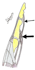 Tendón flexor superficial insertándose en la base de la falange media (Flecha gruesa) y tendón profundo, en la base de la falange distal. (Flecha delgada).
