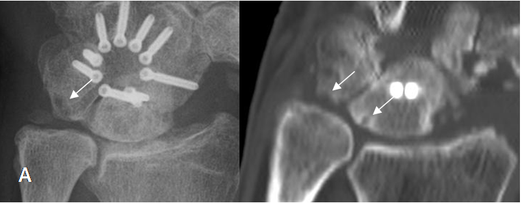 A: Rx AP. Varianza ulnar positiva, con erosión del piramidal. Adicionalmente hay fijación de los huesos del carpo, con ausencia del escafoides.