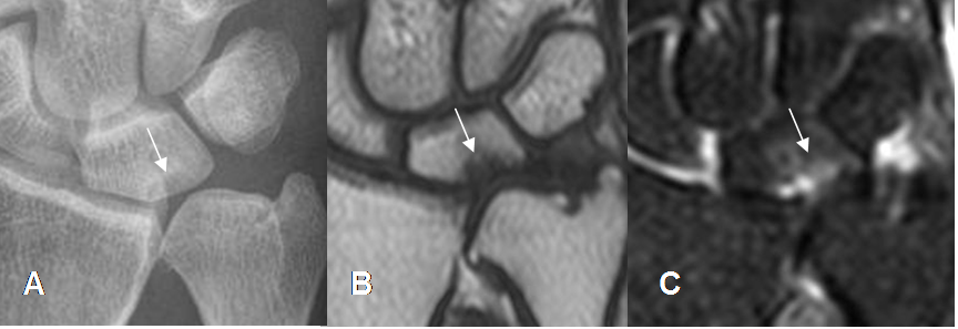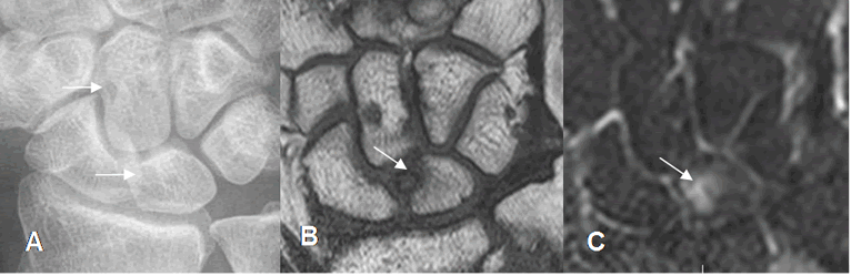 A: Rx AP. Imágenes radiolúcidas en los huesos grande y semilunar, por lesiones osteocondrales.