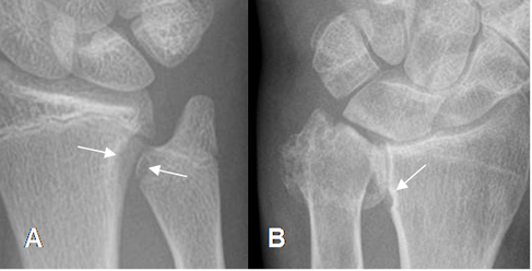 B: Rx AP. Cambios degenerativos en el tercio distal de la ulna, que erosionan el  radio distal.