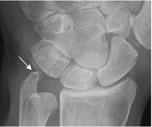 Rx AP. Apófisis estiloides de la ulna muy prominente, en contacto con el piramidal, sin cambios óseos asociados.