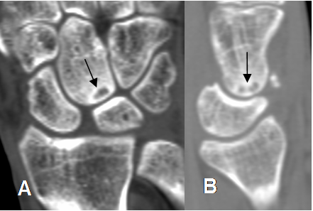 A: TAC reconstrucción coronal y B: Reconstrucción sagital. Lesiones osteocondrales en el hueso grande, por impactación del carpo. Adicionalmente hay signos de inestabilidad, con aumento del espacio escafosemilunar por ruptura ligamentaria e inestabilidad tipo DISI. Fragmento posterior al hueso grande, por fractura.