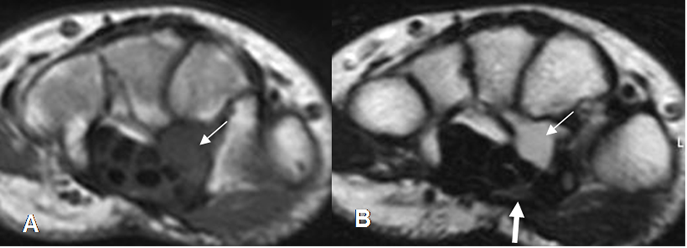 A: RM axial en T1 y B: RM axial en T2. Lesión redondeada isointensa al músculo en T1 e hiperintensa en T2, en la parte superointerna del canal del carpo, que corresponde a ganglión. En T2 el nervio mediano es hiperintenso (Flecha gruesa), por neuropatía compresiva.