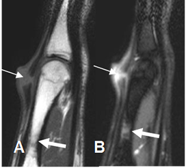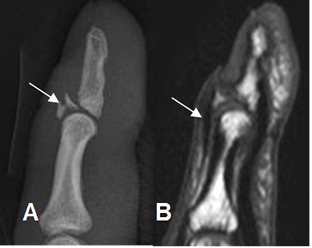 A: RM sagital en T1 y B: RM sagital en STIR. Ruptura no retraída del tendón extensor, sobre el tercio distal del metacarpiano. Adicionalmente hay contusión osea. (Flecha gruesa).