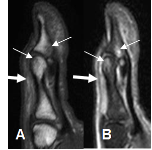 A: RM sagital en T1 y B: RM sagital en STIR. Contusión del pulgar, con edema óseo de la cabeza de la falange proximal y la base de la distal. (Flechas delgadas). Hay cambios inflamatorios rodeando el tendón extensor, el cual permanece integro. (Flecha gruesa).