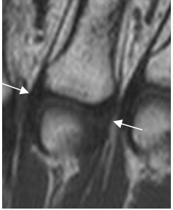 RM coronal en T2. Estructuras hipointensas en todas las secuencias, que corresponden a los ligamentos interfalángicos normales.