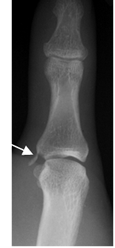 Rx AP. Fragmento óseo en la parte medial sobre la base de la falange media, por avulsión del ligamento colateral.