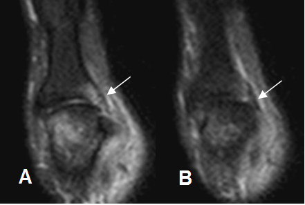 A y B: RM coronal en STIR. Contusión de la falange proximal. Hay cambios inflamatorios rodeando el ligamento colateral lateral, el cual permanece íntegro, por esguince GI.