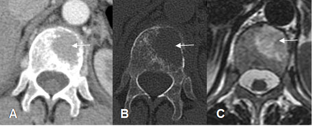 A: TAC axial en ventana de tejido y B: en ventana de hueso. Lesión  focal en el lado izquierdo del cuerpo vertebral, por plasmocitoma solitario.