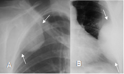 A y B: Rx PA. Imágenes densas y de bordes bien definidos, que forman ángulos obtusos con la pared costal, indicando ubicación extrapleural.