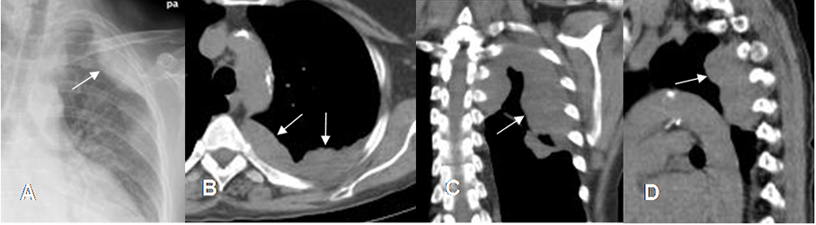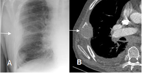A: Rx PA. Imagen de localización extra-pleural, en el tercio superior del hemitórax izquierdo.