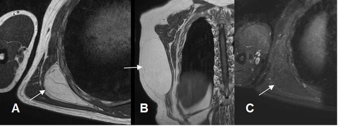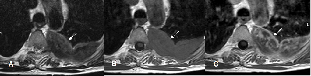A: RM axial en T1, B: RM coronal en T1 y C: RM axial en STIR. Lesión ovalada y de bordes definidos en la pared posterolateral de la reja costal, hiperintensa en T1 y que suprime en STIR, compatible con lipoma. Muestra capsula hipointensa y algunos septos delgados.