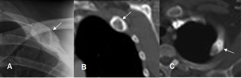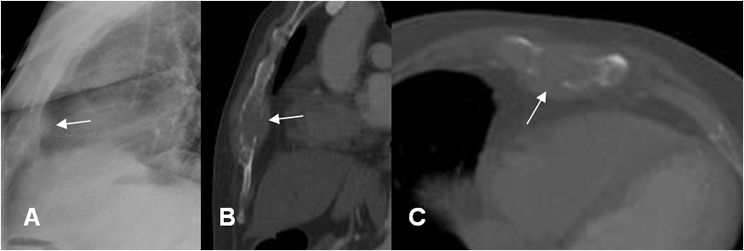 A: Rx AP, B: TAC reconstrucción coronal y C: TAC axial. Lesión expansiva de bordes escleróticos en la 2º costilla, por displasia fibrosa.