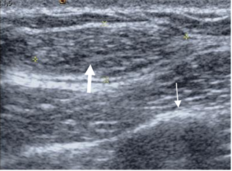 Ecografía. Lesión sólida, superficial y de bordes definidos en la pared costal , compatible con lipoma (Flecha gruesa) y en relación con la costilla (Flecha delgada).