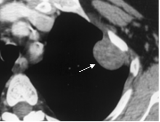 TAC axial. Imagen sólida en relación con el arco costal, que corresponde a neurofibroma.