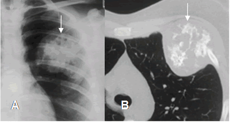 A: Rx PA y B: TAC axial. Imagen densa con ángulos obtusos, que ocasiona destrucción del arco costal, lo que confirman su localización extrapleural.
